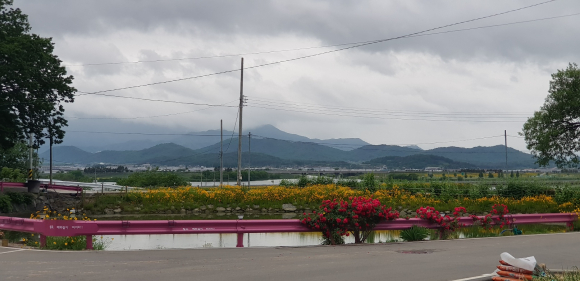 가드레일에 마가렛 화분이 놓이기도 하고, 못둑으론 금계국이 피고, 줄장미가 새빨갛고 고운 꽃잎을 자랑하기도 합니다. 멀리 금오산이 여신의 자태로 누워있는 모습이 늘상 보이는데 가끔은 구름에 뒤덮여 있기도 하고요. 낙동강은 이 마을과 함께해 온 젖줄이지요. 걸에 가서 목욕도 하고, 낙동강가에서 헤엄치다가 아이 몇이 휩쓸려 영영 돌아오지 못해 가슴에 묻었다는 슬픈 이야기가 있는 마을.