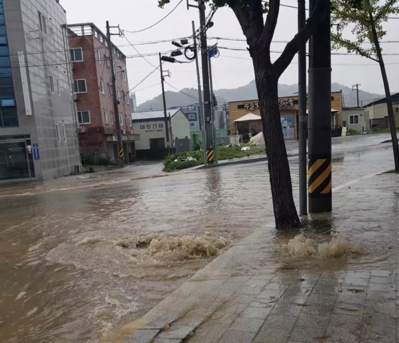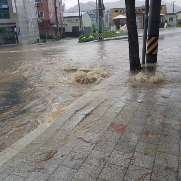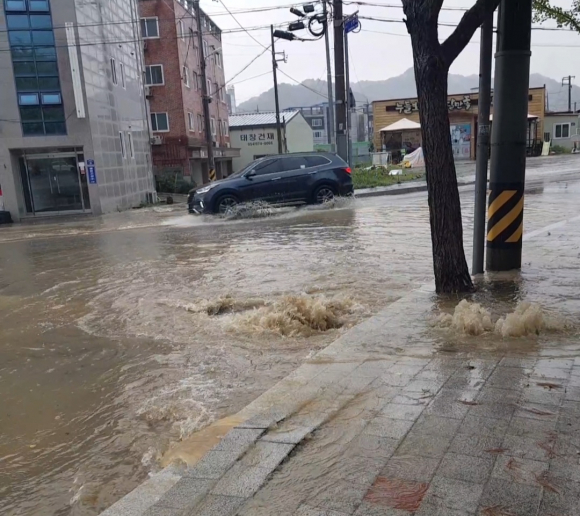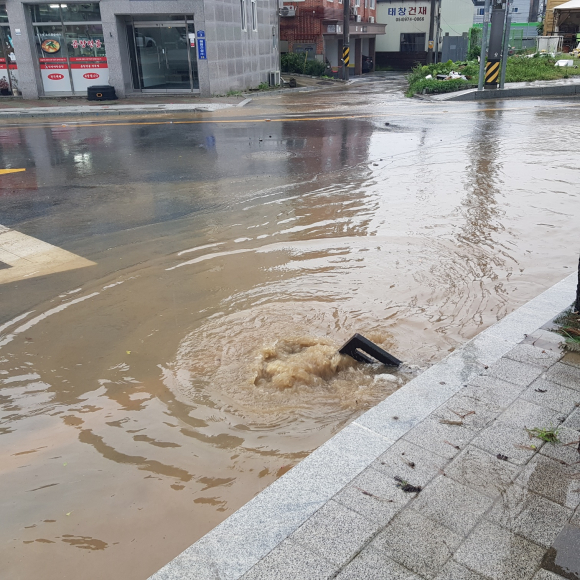 지나가는 차들의 바퀴가 잠길 정도로 삽시간에 불어난 물이 인도까지 넘어왔고 수압을 견디지 못하고 하수도 뚜껑이 비스듬하게 걸쳐 있고 우수관 아래로 급한 물살이 쿨렁거리며 흘러갔습니다.