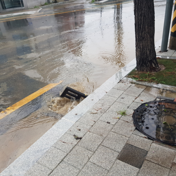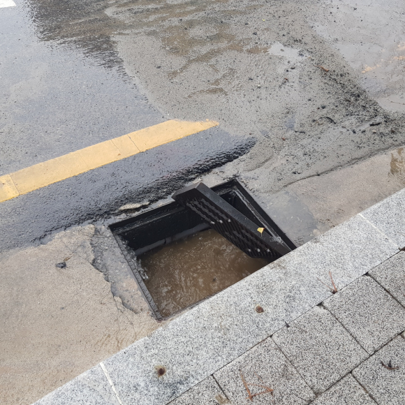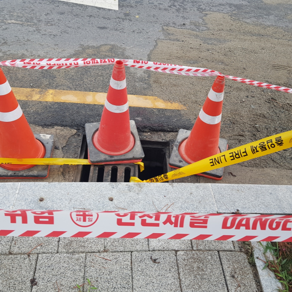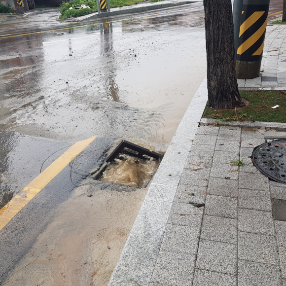 하수도를 덮어놓던 덮개가 한쪽은 비스듬했고 나머지 하나는 보이지 않았습니다. 아마 물이 역류할 때 그 압력으로 하수도 안쪽으로 들어간 것으로 보였고, 덮개가 없는 하수도가 노출된 모습은 행인이나 차들이 다닐 때 위험해 보였습니다.