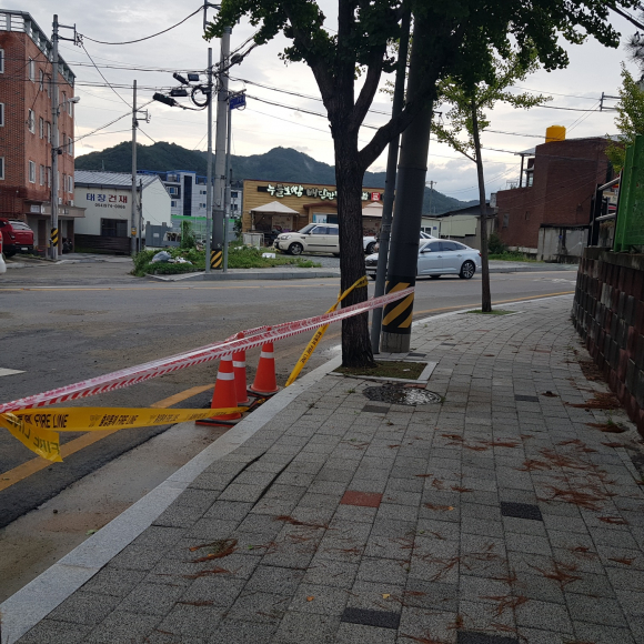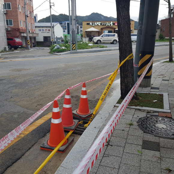 잠시 후 출동한 경찰관들이 왔고 상황을 설명하고 자리를 떠났습니다. 1시간 후 현장을 조치했다는 연락이 왔습니다. 다시 그 자리에 갔을 때 위험을 알리는 긴 줄이 빙 둘러 있었고, 안전 라바콘이 세워져 있어서 주의하도록 표시가 되어 있었습니다.