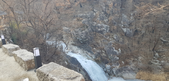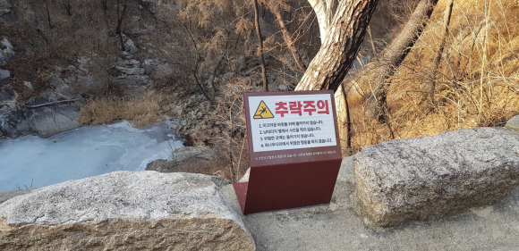 특히 겨울철 산길에 물이 얼어붙은 곳도 있고, 사진을 찍거나 장난치다가 추락할 위험이 상존하고 있어 안전요원 배치와 안전난간 설치가 반드시 필요하다는 의견입니다.