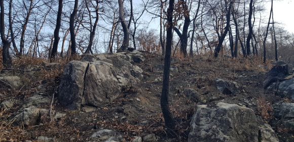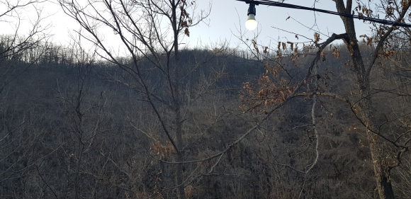 산불 피해 복구가 아직 끝나지 않아 불에 탄 집터에 새로 집을 짓는 공사가 한창 진행 중이고, 임시 숙소가 마련되어 산불 피해 이재민들이 머무르고 있습니다. 만휴정 주변의 수목들도 불에 탄 채 남아 있고 특히 소나무나 침엽수는 산불 피해로 까맣게 말라 있습니다.