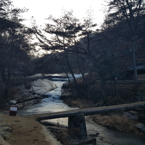 산길을 따라 5분 정도 만휴정까지 올라가는 길에는 예전과 다르게 여러 군데 포토존이 설치되었습니다. 만휴정과 송암폭포는 지금 겨울철이라 흘러내리는 물이 얼어 장관을 연출하고 있습니다.