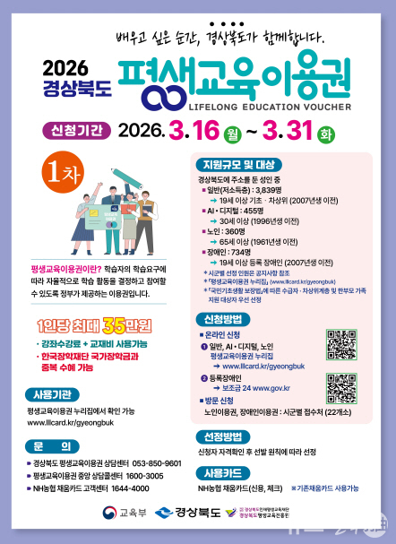 고령군 관계자는 “평생교육 이용권은 단순한 경제적 지원을 넘어 군민의 삶의 질 향상과 자아실현을 돕는 핵심 정책”이라며 “앞으로도 계층별·생애주기별 맞춤형 지원을 강화해 사각지대 없는 평생학습도시 고령을 만들어 나가겠다.”고 전했습니다.