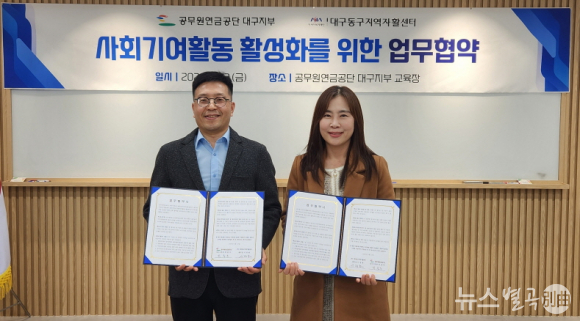 공무원연금공단(이사장 김동극, 이하 공단) 대구지부와 대구동구지역자활센터(센터장 서정화)는 3월 13일 공단 대구지부 교육장에서 사회기여 활동 활성화를 위한 업무협약을 체결했습니다.