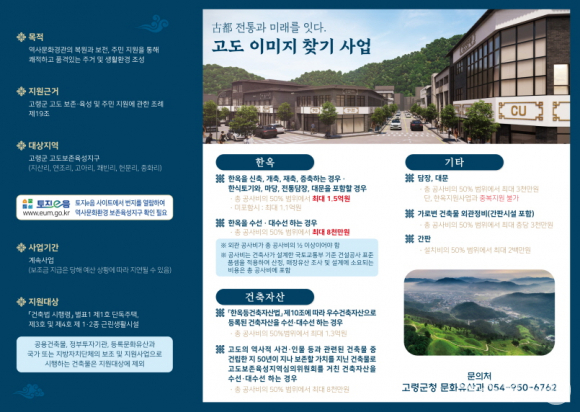 고령군 관계자는 “이번 고도 이미지 찾기 사업은 지산동 고분군 세계유산 등재 및 고도 지정으로 높아진 고령군의 위상에 걸맞은 역사문화도시 경관을 조성하는 뜻깊은 사업”이라며 “주민들의 쾌적한 정주 여건 마련과 지역 경제 활성화에도 기여할 수 있는 만큼 많은 관심과 참여를 당부드린다.”고 전했습니다.