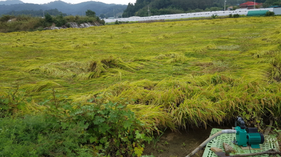 논에서는 수확을 앞둔 벼가 무게를 견디지 못하고 쓰러졌으며, 밤새 물을 빼낸 양수기가 당시 상황을 짐작케 한다.