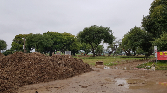 미탁의 직격탄을 맞은 성밖숲은 복구가 끝날 때까지 방문객의 출입을 통제하고 있다. 300㎖에 가까운 집중호우로 순식간에 물에 잠긴 성밖숲은 이천변의 펜스가 소실되고 떠내려 온 나뭇가지와 폐목들이 무더기로 쌓여있다.