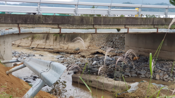 지난 7일 벽진면 운정교 부근. 농로가 휩쓸려 내려가 파손된 곳을 긴급 보수하는 중이다. 가드레일이 넘어가고 옹벽도 금이 가거나 무너져 내린 곳도 있다.
