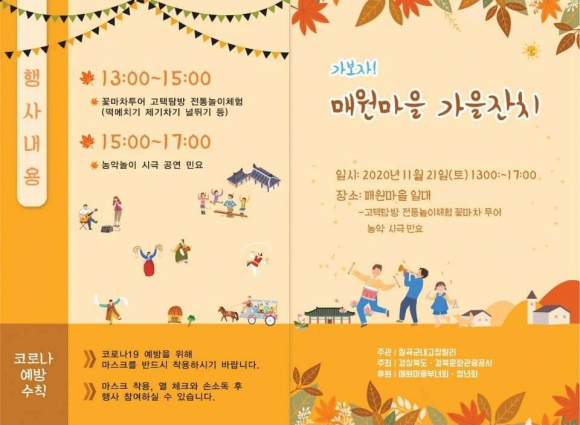 경상북도와 경북문화관광공사가 주최하고 칠곡군내고장알리미 연합회가 주관하는 ‘가보자! 매원마을 가을잔치’가 21일 오후 1시부터 매원마을에서 열린다.
