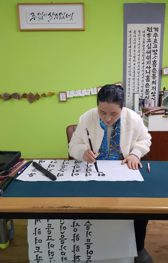 “저에겐 서예가 친구죠. 서예를 하다보니 너무 빠진거죠. 너무 빠지다보니 외로움을 느낄 시간이 없었어요. 같은 아파트에 살던 이웃들이 저에게 그랬어요. 처음엔 저를 안좋게 이야기했어요. 배우러 다닌다고 이웃들과 이야기도 하지 않으니까. 그런데 나중에 제가 서예학원을 내니까 부러워하더군요. 그래서 내가 잘 했다, 쉼없이 살아왔고 그 결과 글씨로 보여주는 삶이 됐으니까 열심히 살았다고 생각해요.